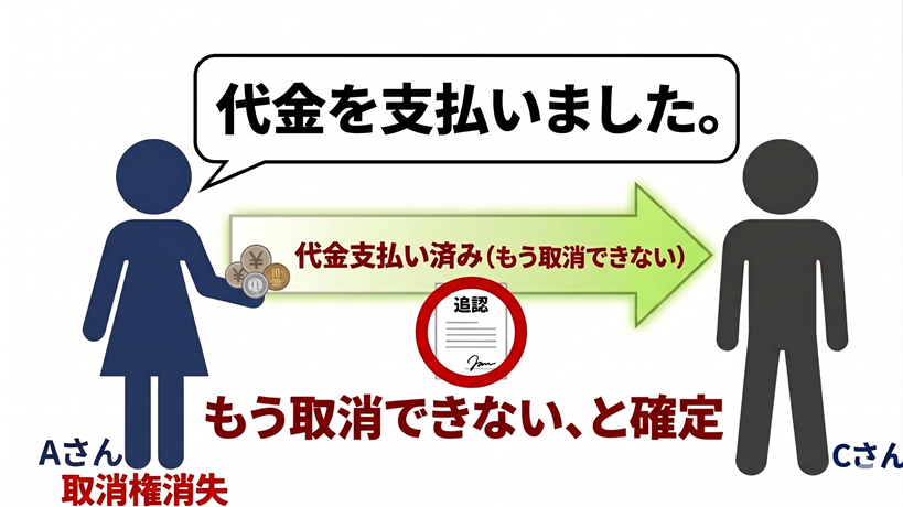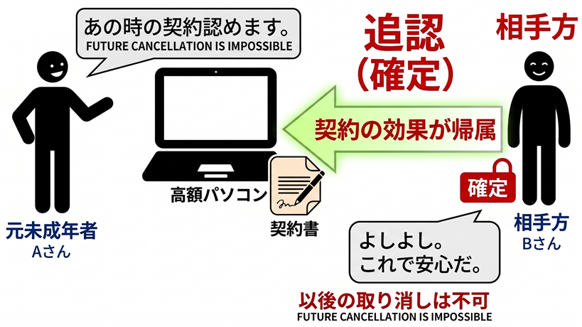過去に支払った代金や受け取った商品の法的な根拠が、遡って正当なものとして確定するのです。この場合、本人は、以後、やはり契約を取り消して代金を返せ、といったことができなくなります。