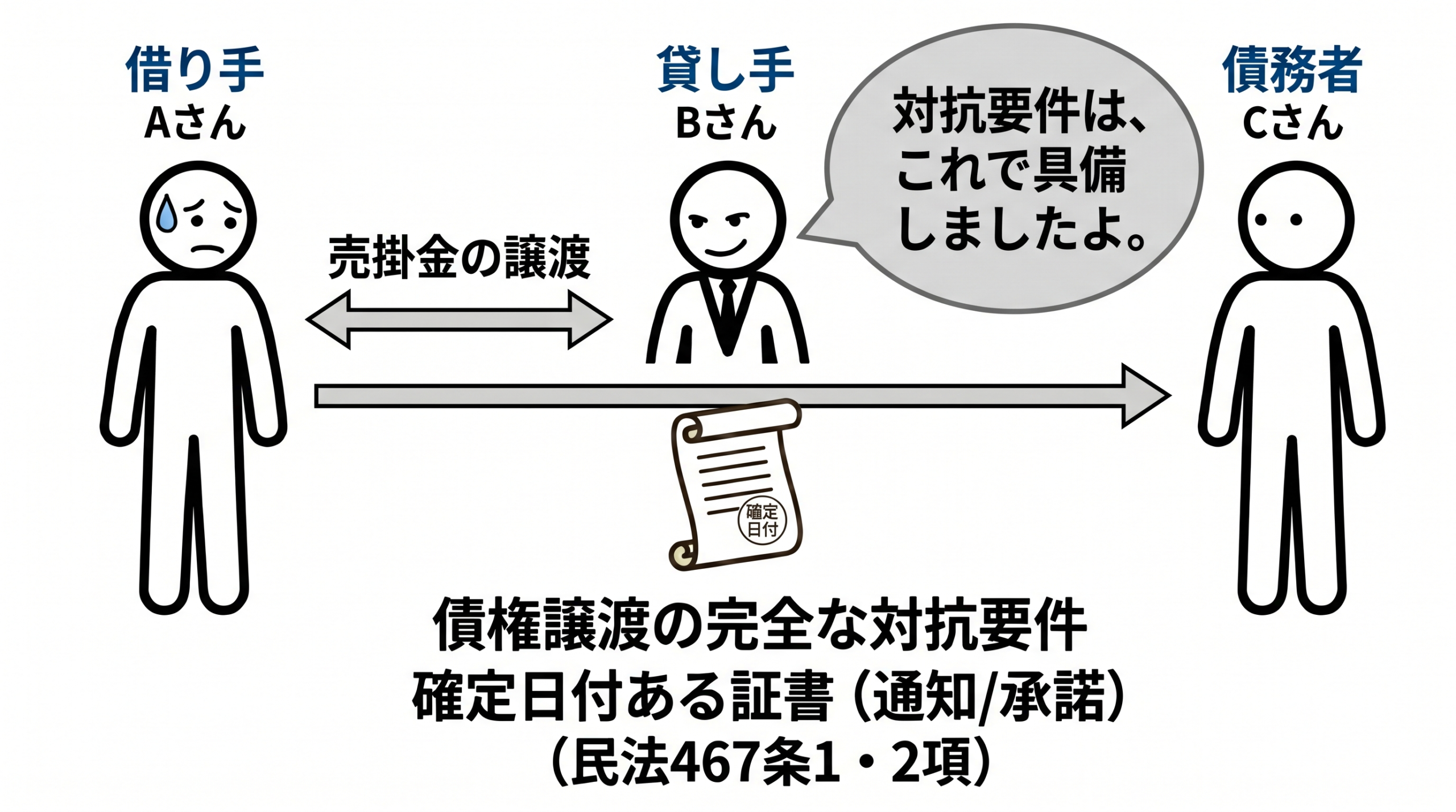 債権譲渡を第三者に主張するためには、債務者への通知や承諾といった「対抗要件」が必要です。