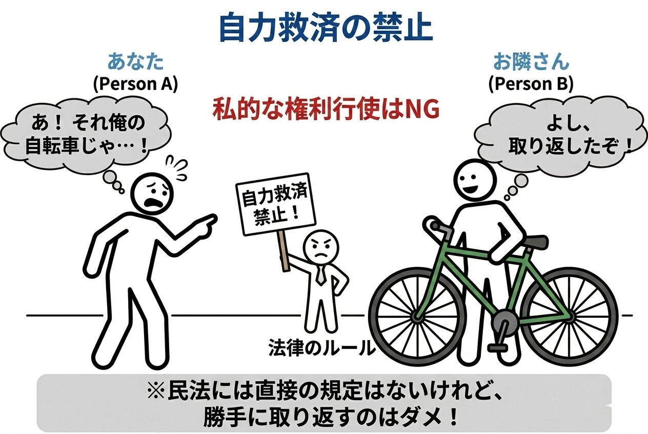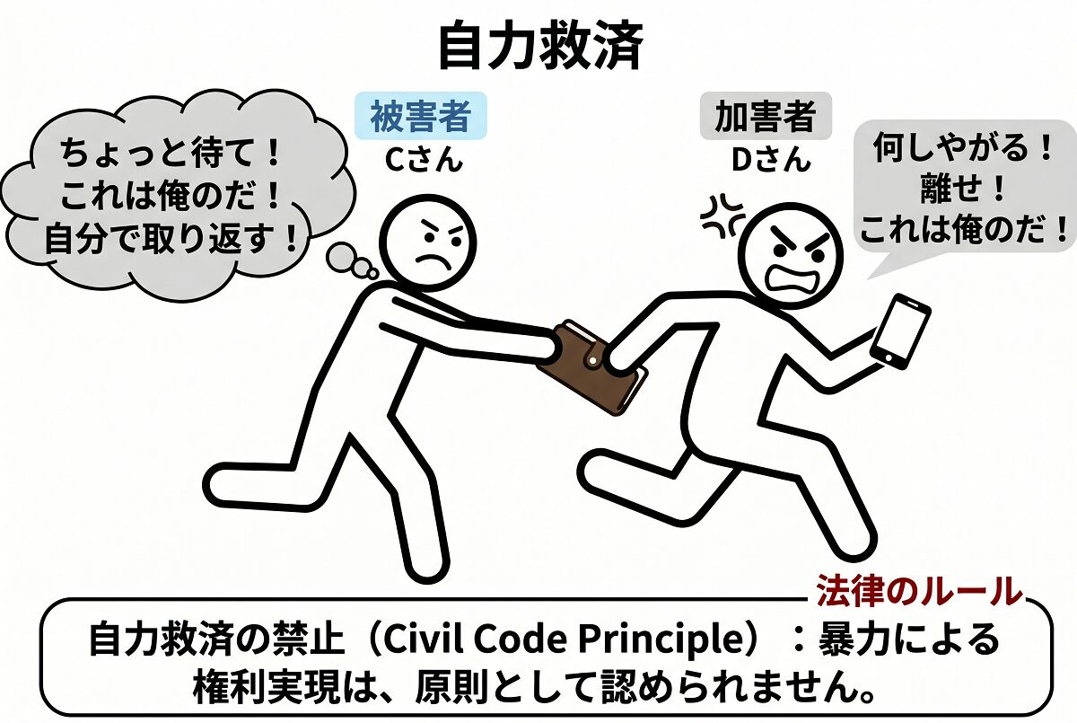このケース、普通の人は、その場で取り返したくなると思います。しかし、自力救済禁止の原則を貫徹すればそれもできません。