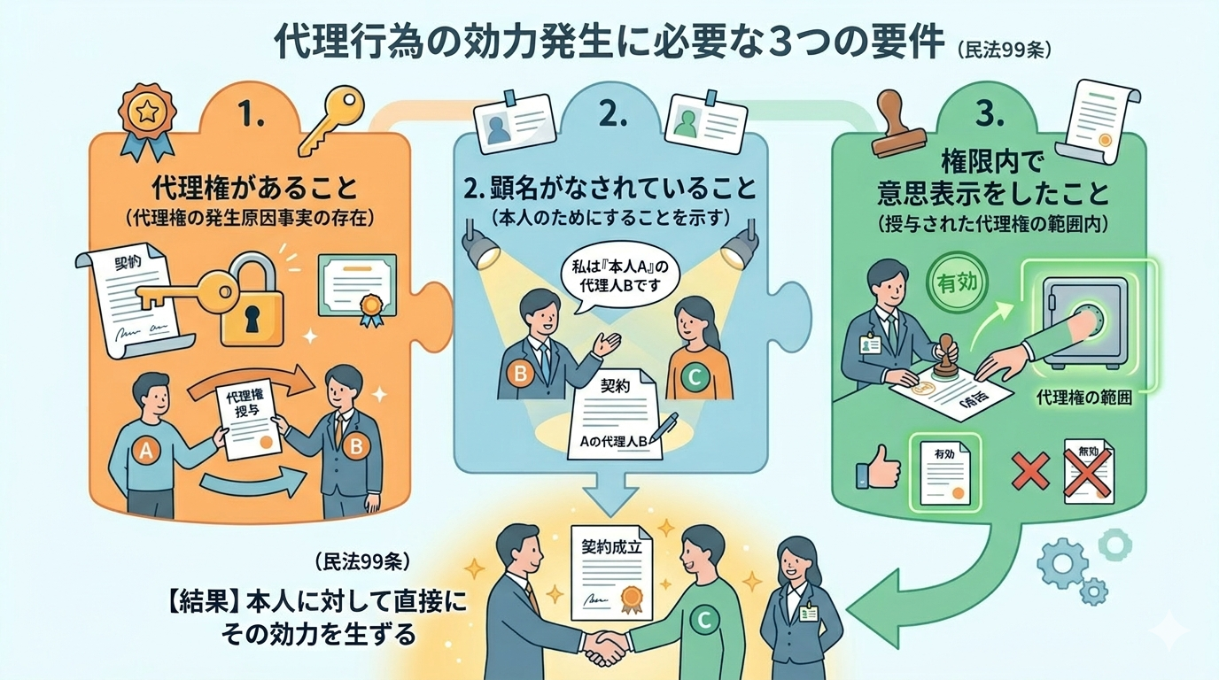 今回は、民法における「代理行為」の要件についてです。規定しているのは民法99条。