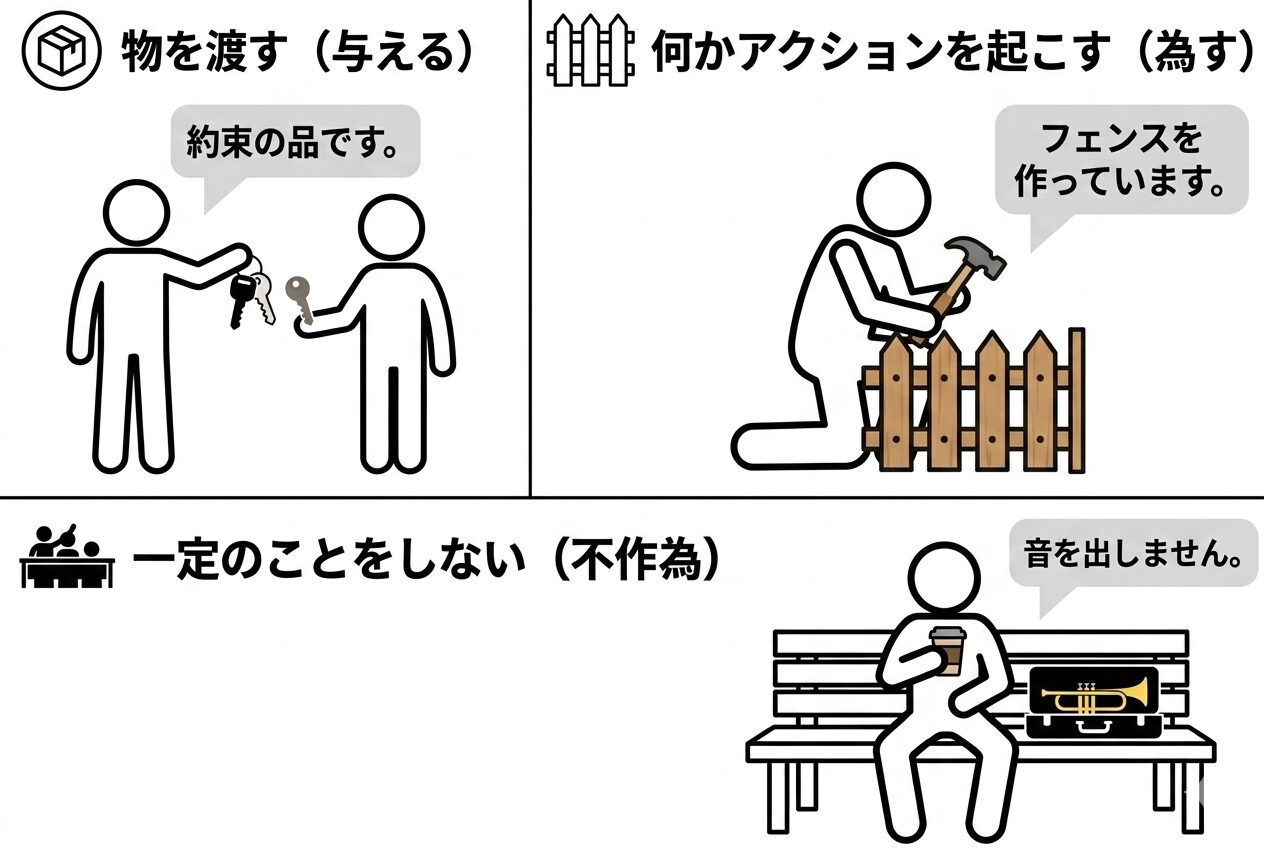 たとえば、「物を渡す(与える)」、「何かアクションを起こす(為す)」、あるいは「一定のことをしない(不作為)」という区別です。