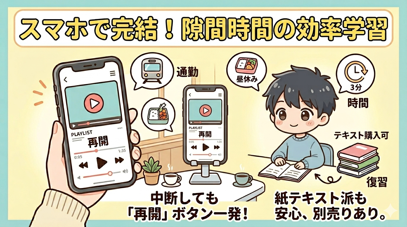 本型・書籍型のテキストもありますが、スマホだけでも勉強ができるため、本当に手ぶらでの学習が可能。