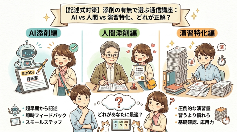 フォーサイトやTEPPANのように、あえて添削機能を設けず、質の高い解説講義や教材に特化するスタイル。これは「添削にかかるコストや時間を、演習量の確保に全振りする」という非常に合理的な戦略です。 しかし、第三者の客観的なチェックが入らない以上、学習者には**「自分を冷徹に律する視点」**が不可欠になります。添削なしのスタイルで合格を勝ち取るために、絶対に注意すべき「3つの落とし穴」と対策を解説しま […]