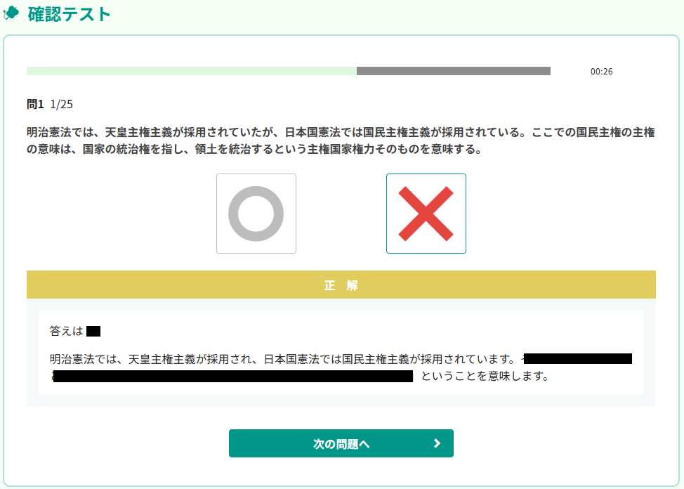 チェックテストよりも難易度が高く、判例の細かな知識や言い回しが問われます。「過去問の答えを覚えてしまった」という人でも、初見の問題として真剣に向き合わざるを得ません。 -