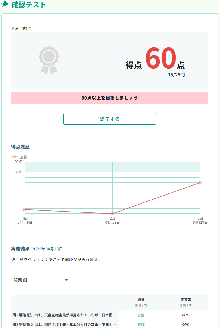 繰り返し挑戦することで、自身の累計正答率を塗り替えていく楽しみもあり、ゲーム感覚で定着率を高められます。
