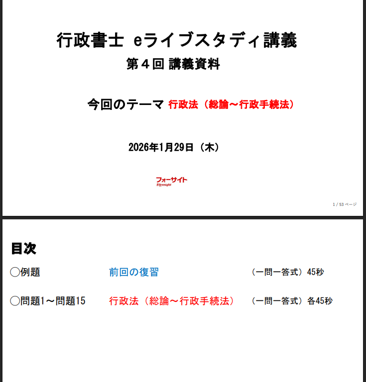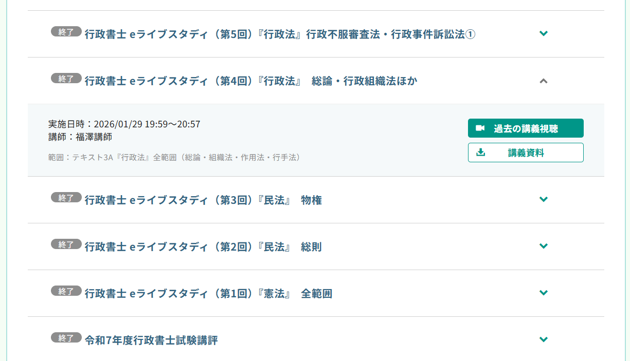 また、スケジュール表にある通り、配信はテキストの進行(例:行政法 総論〜行政手続法)に合わせて設定されています。決められた日時に演習を行うことが、学習のペースメーカーとなり、独学では疎かになりがちなアウトプットを習慣化させます。