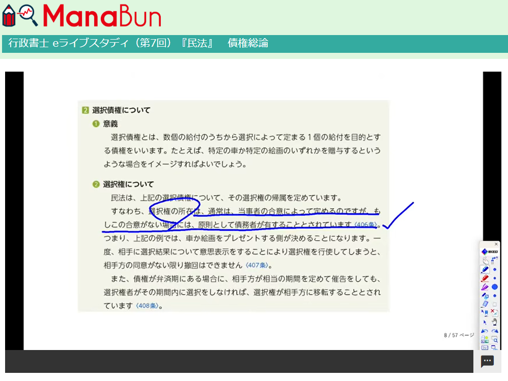 eライブスタディでは、講師が受講生と同じテキストを画面に投影し、リアルタイムでアンダーラインやチェックを書き込みながら解説しています。