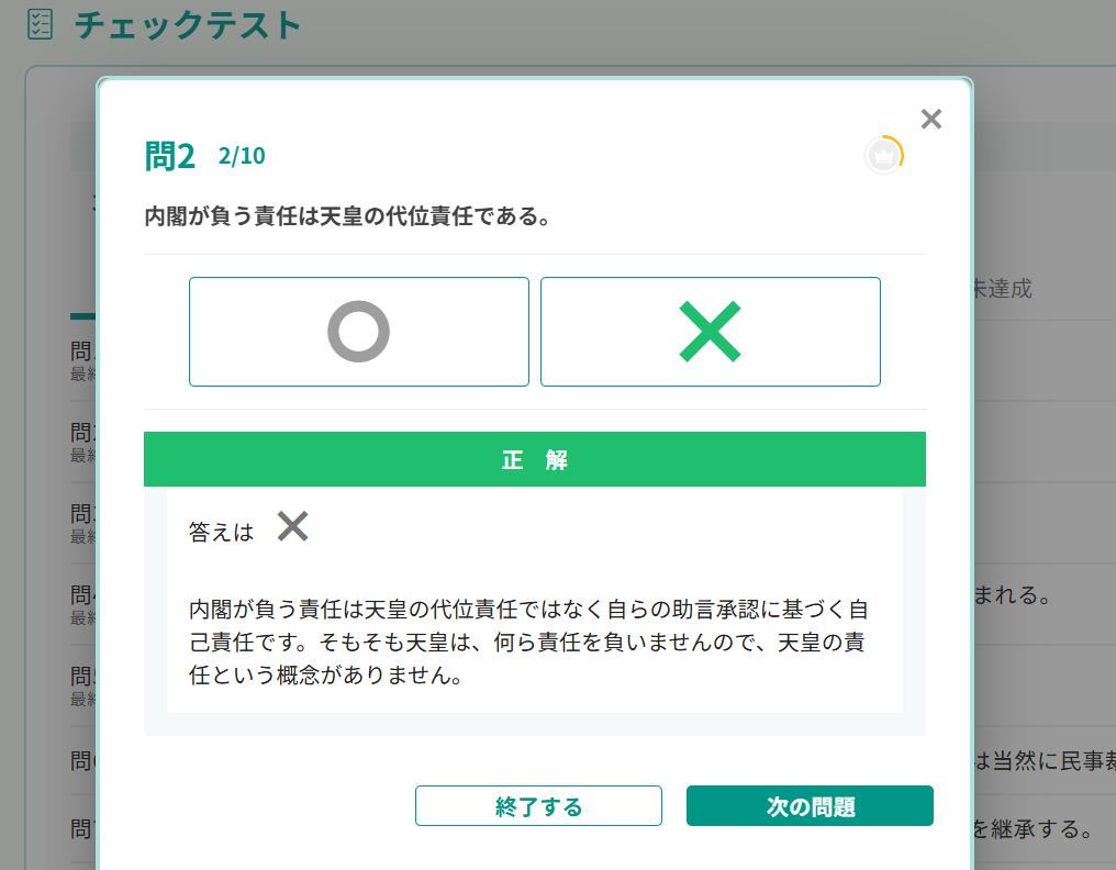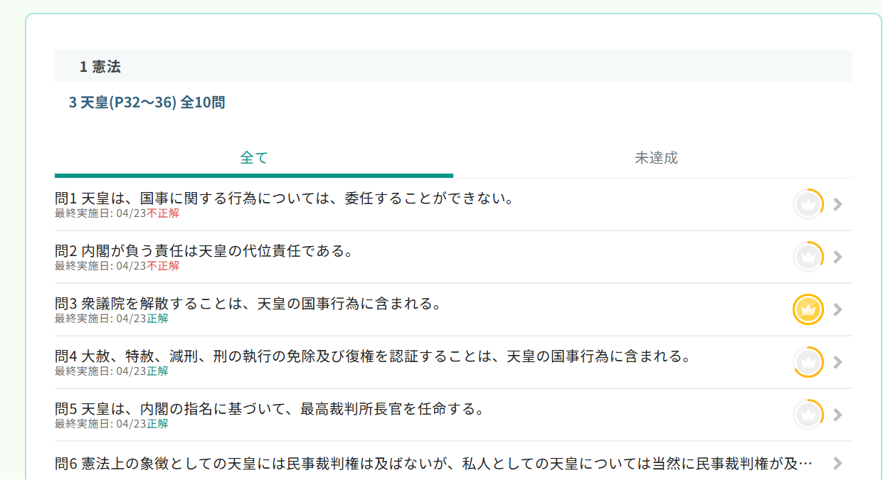 3回正解するとつく**「王冠アイコン」。これを時期を分けて積み上げることで、行政書士試験の膨大な知識を長期記憶へと定着させます。たとえば次のような活用が可能です。