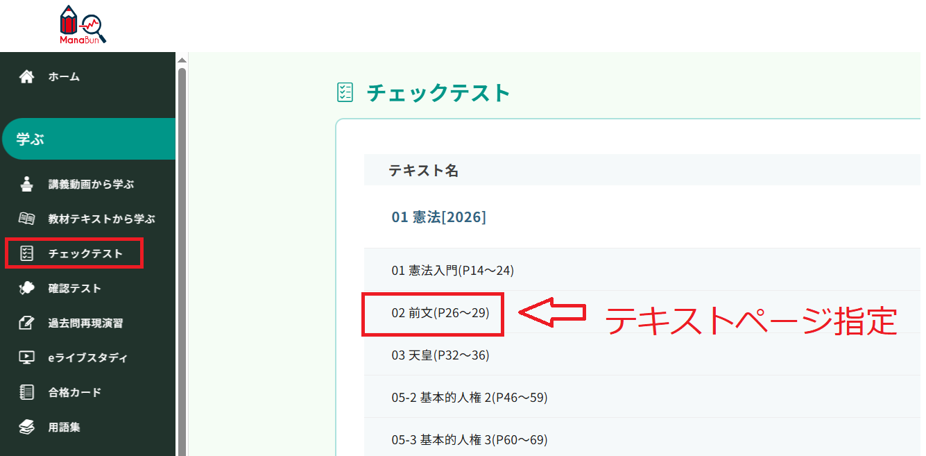 また、チェックテストでは、出題範囲が「テキストの〇ページから〇ページまで」と細かく指定されているため、読んだ直後に解き、間違えたら即座に戻るという理想的なサイクルが自動的に作られます。