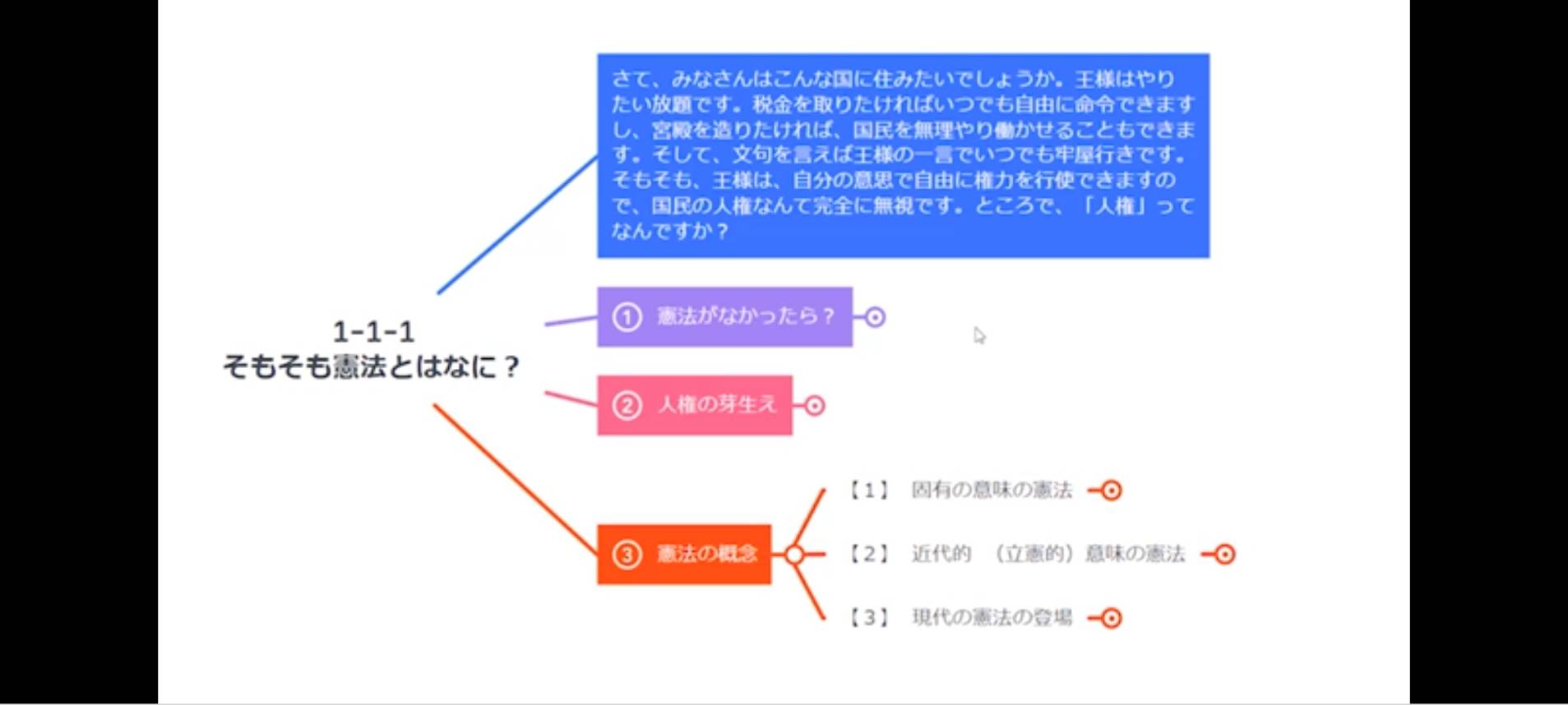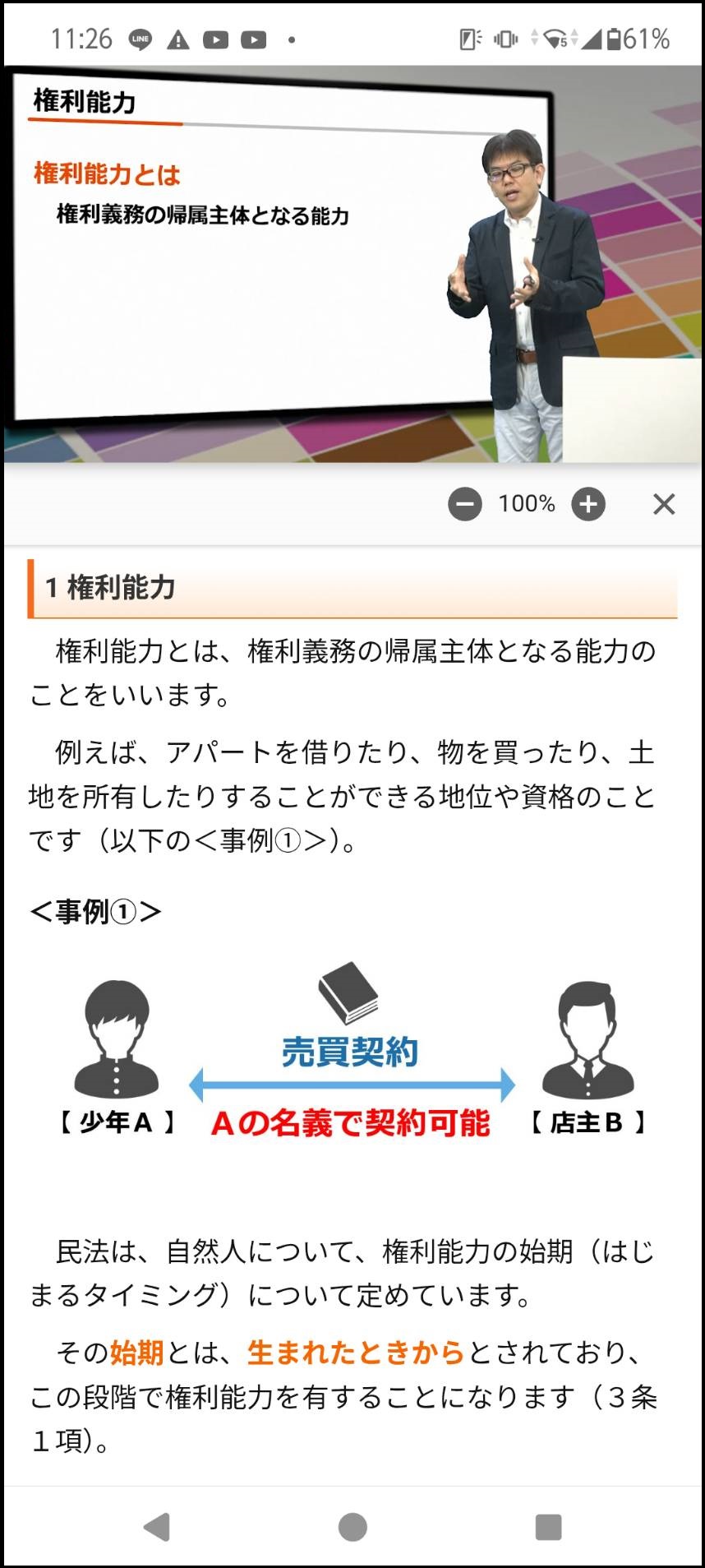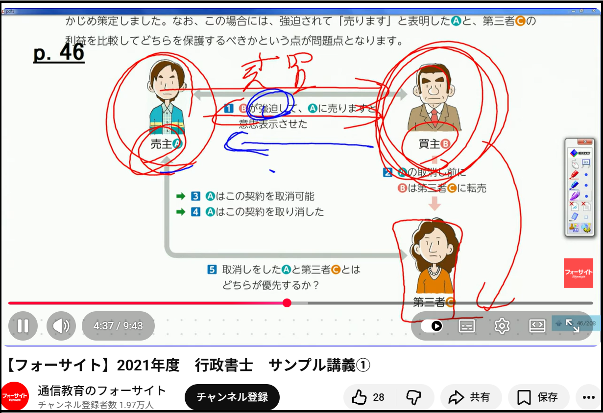 私のパソコンでフォーサイトの動画(フォーサイト2021年行政書士 サンプル講義(YouTube)より引用)を確認すると、ディスプレイはこの画像のようになります。✅法律の講座は得てして単調になりがちですが、フォーサイトの講義は、有名講師が表情や身振りを交えて解説する、講師がテキストの重要個所にマーキングをしていきながら解説をするなどの場面が随時切り替わりながら行われるため、単調さを感じさせません。